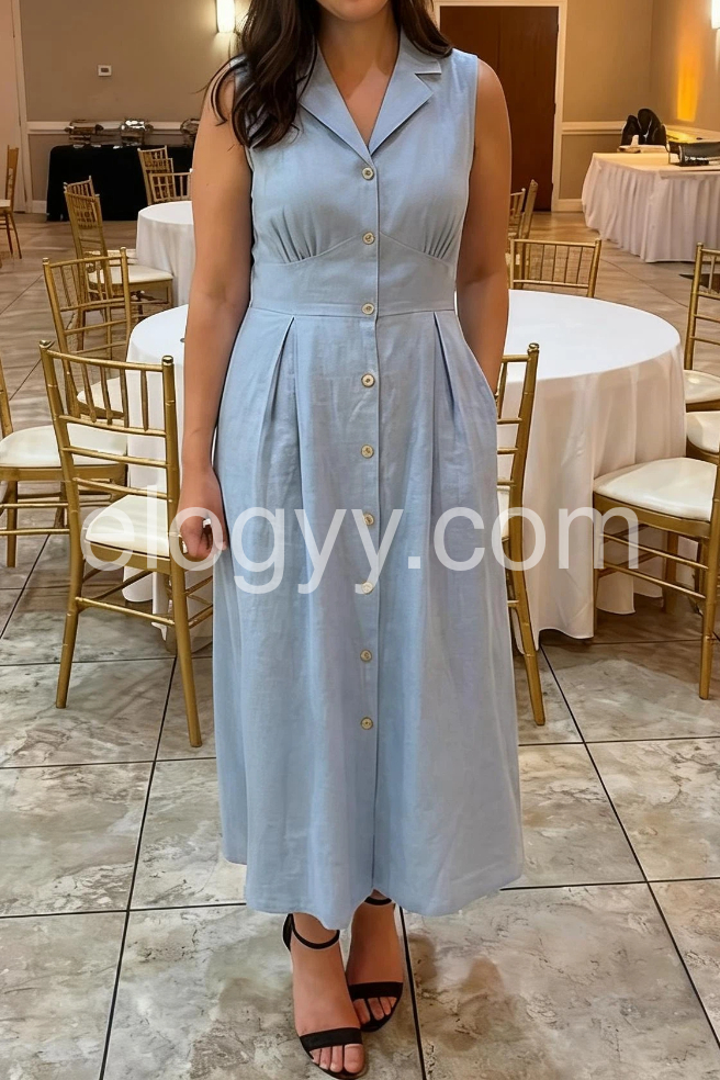 This maxi dress features a crisp light blue hue with a collared neckline and front button closure. The sleeveless design and A-line silhouette offer a relaxed, flattering fit. Made from lightweight fabric perfect for warm weather. Ideal for casual outings or summer events. Effortlessly stylish with a timeless appeal.