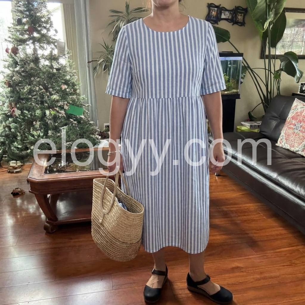 This dress embodies the essence of effortless Mediterranean chic. The classic vertical blue-and-white stripe print evokes a fresh, airy sensibility, perfect for sunlit escapes.