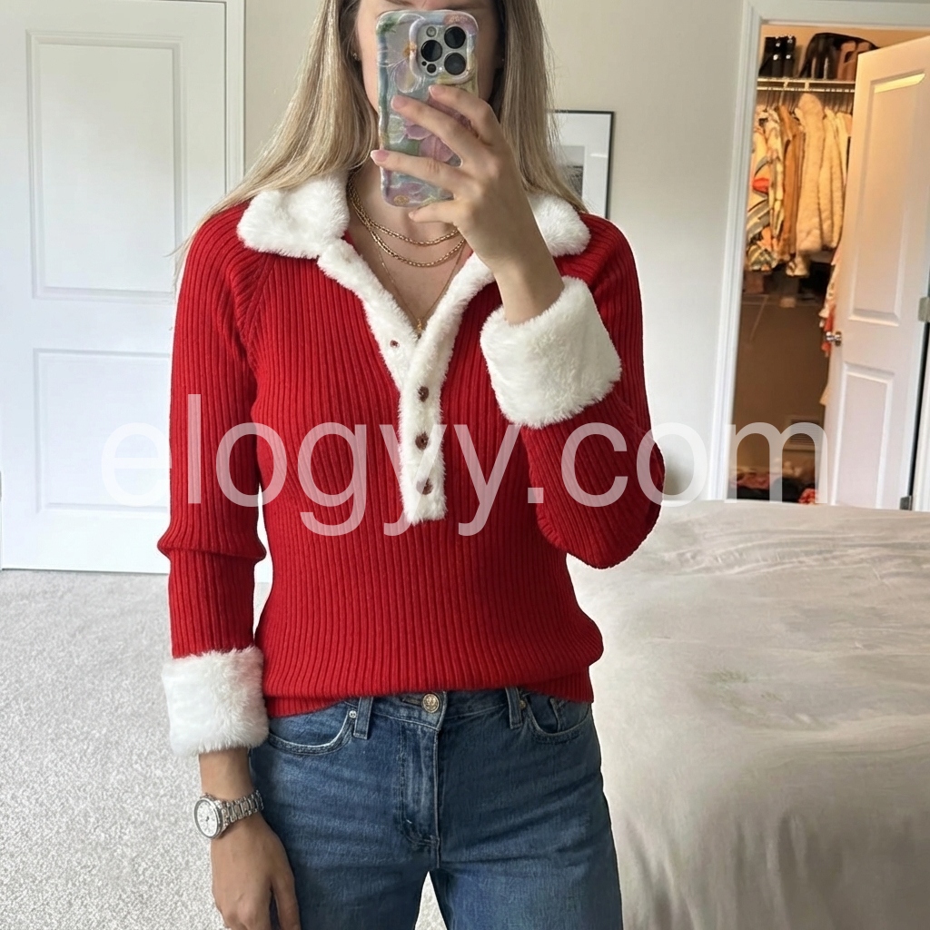 This red ribbed top features a striking color block design and a faux fur trim that adds a touch of luxury to everyday wear. Equipped with button-front closure, it allows for versatile styling and easy layering. The ribbed fabric offers a comfortable, form-fitting silhouette, making it ideal for both casual and polished looks.