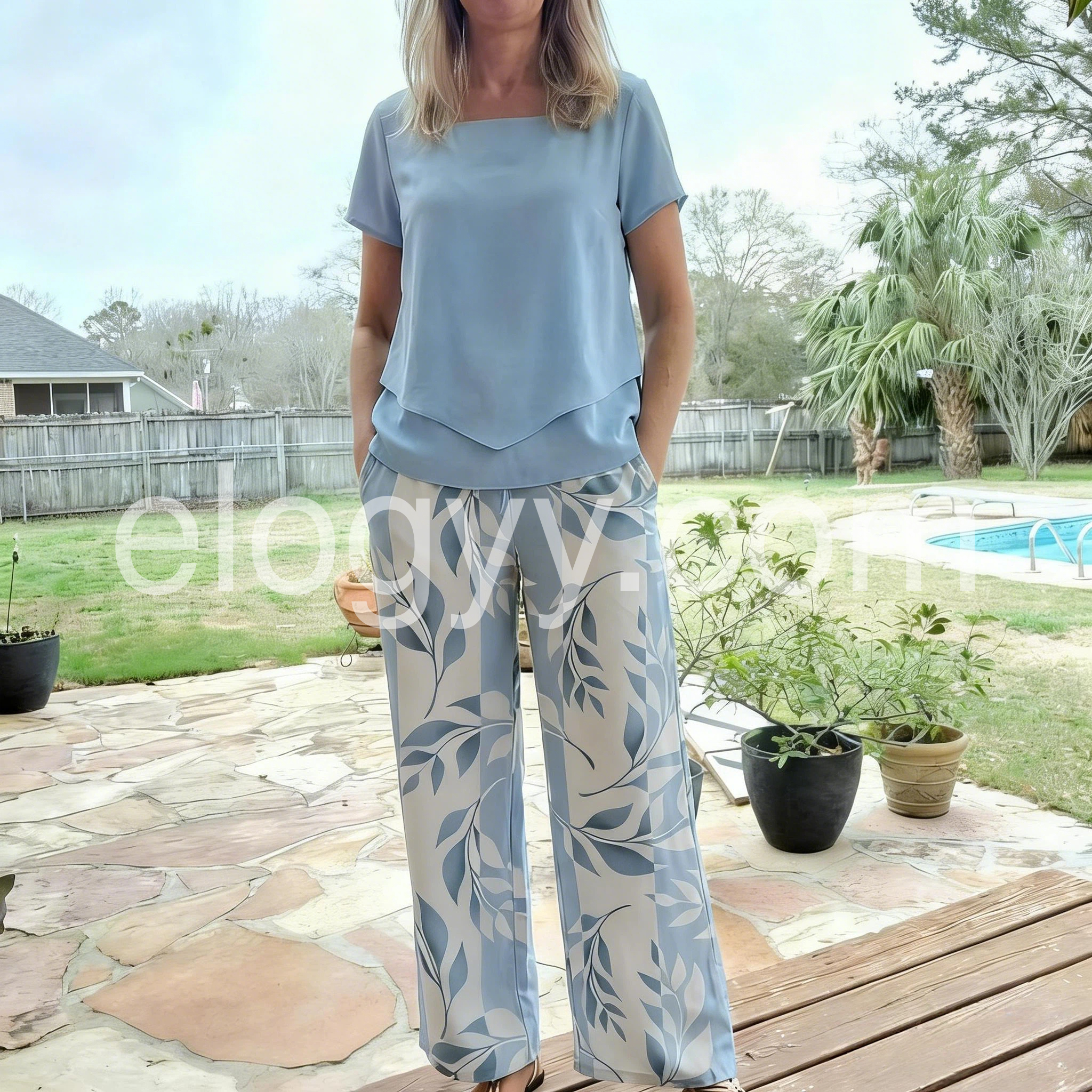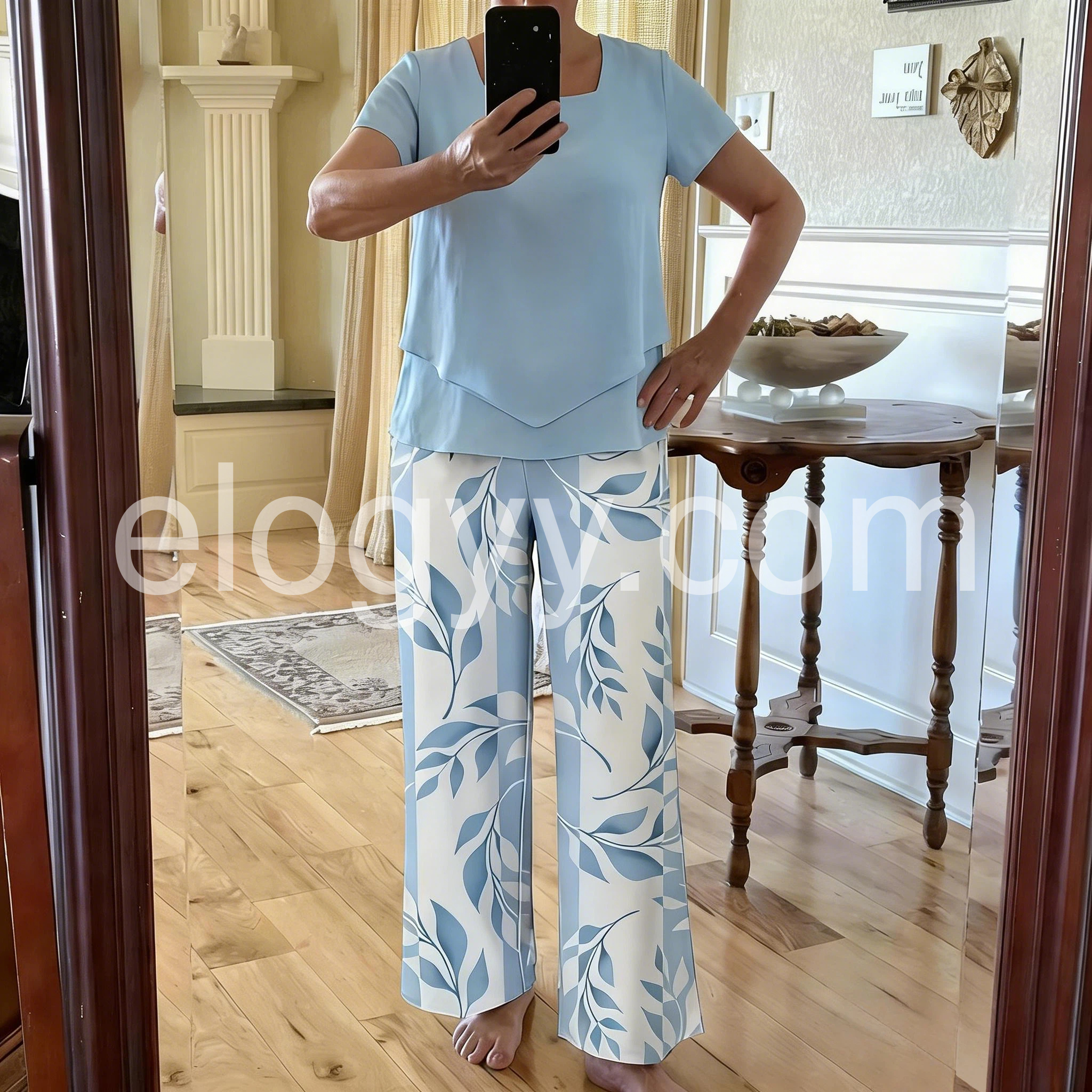 This two-piece set features a relaxed-fit top with a layered hem. Paired with wide-leg pants in a soft leaf print. Lightweight and breathable fabric perfect for warm days. Ideal for casual outings or lounging. Stylish and effortless.