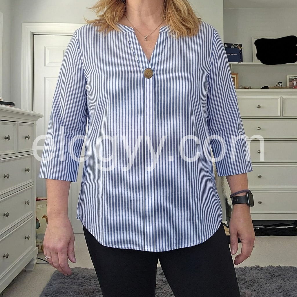 Very nice fabric. Quality made. Pretty stripped prints. Whether semi-dressy or casual, it is really nice. It has the right amount of coverage on my chest so that I can bend over doing gardening work or picking up my grandchildren. True to size.