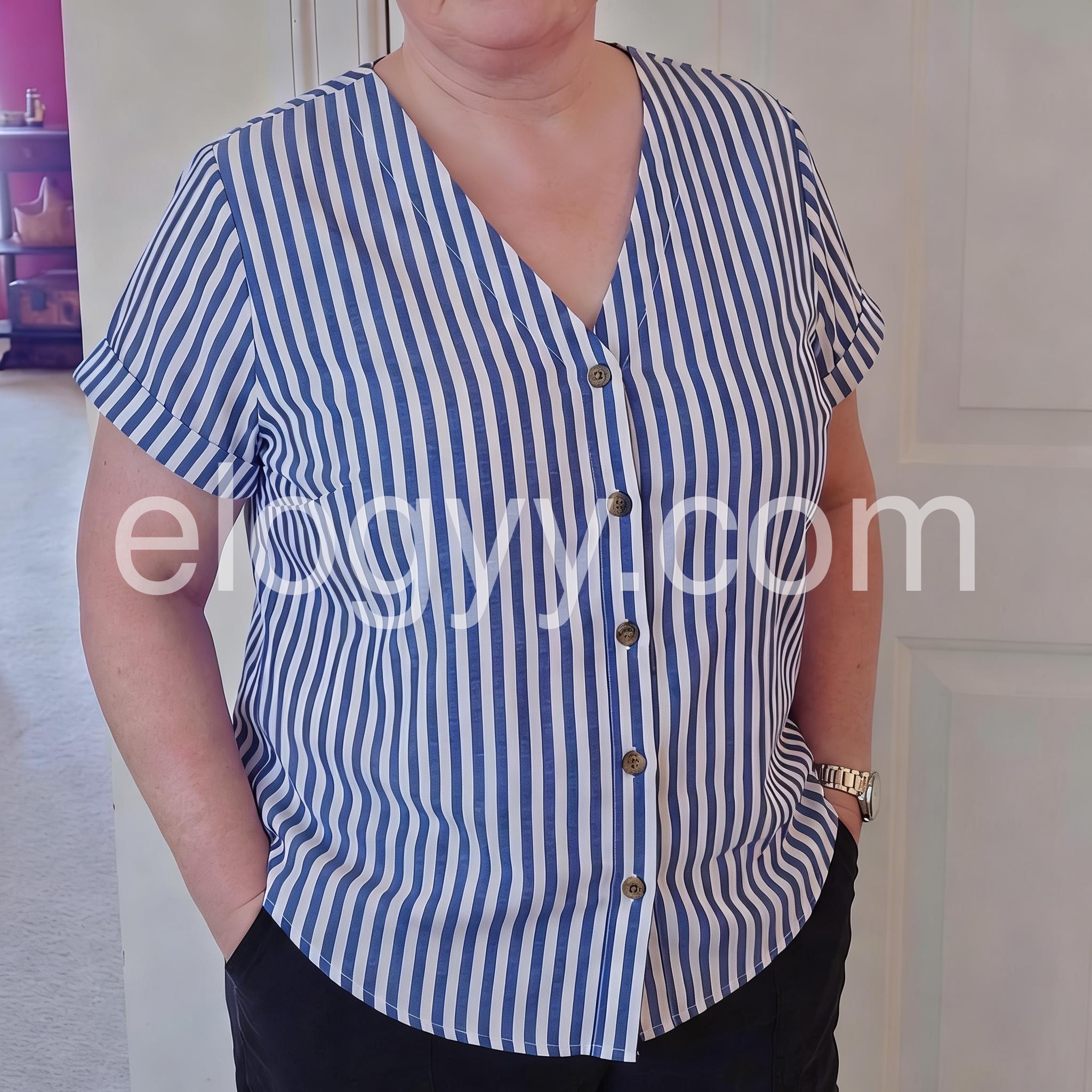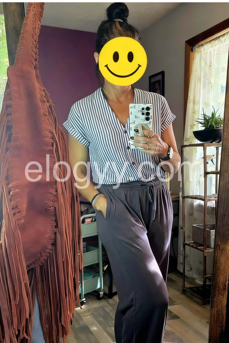 This V-neck top features vertical blue and white stripes with a front button closure. Rolled short sleeves add a relaxed, breezy touch. Lightweight fabric perfect for warm days. Pair with jeans or shorts for a timeless look. Effortlessly chic and easy to style.
