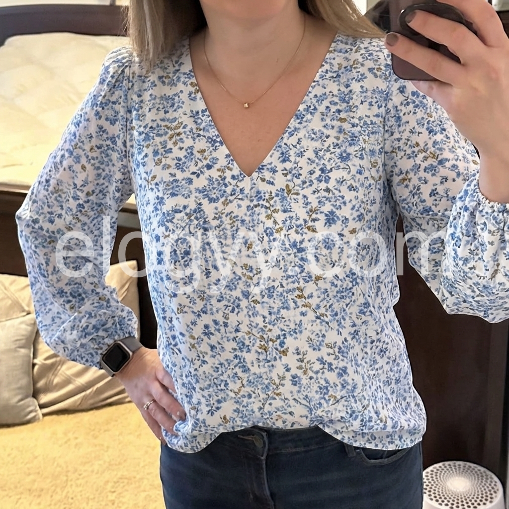 This V-neck top features a delicate blue floral print on a soft white base. Long puff sleeves with gathered cuffs add feminine flair. Lightweight fabric perfect for spring and summer. Pair with jeans or high-waisted pants for a stylish look. Effortlessly elegant with vintage charm.