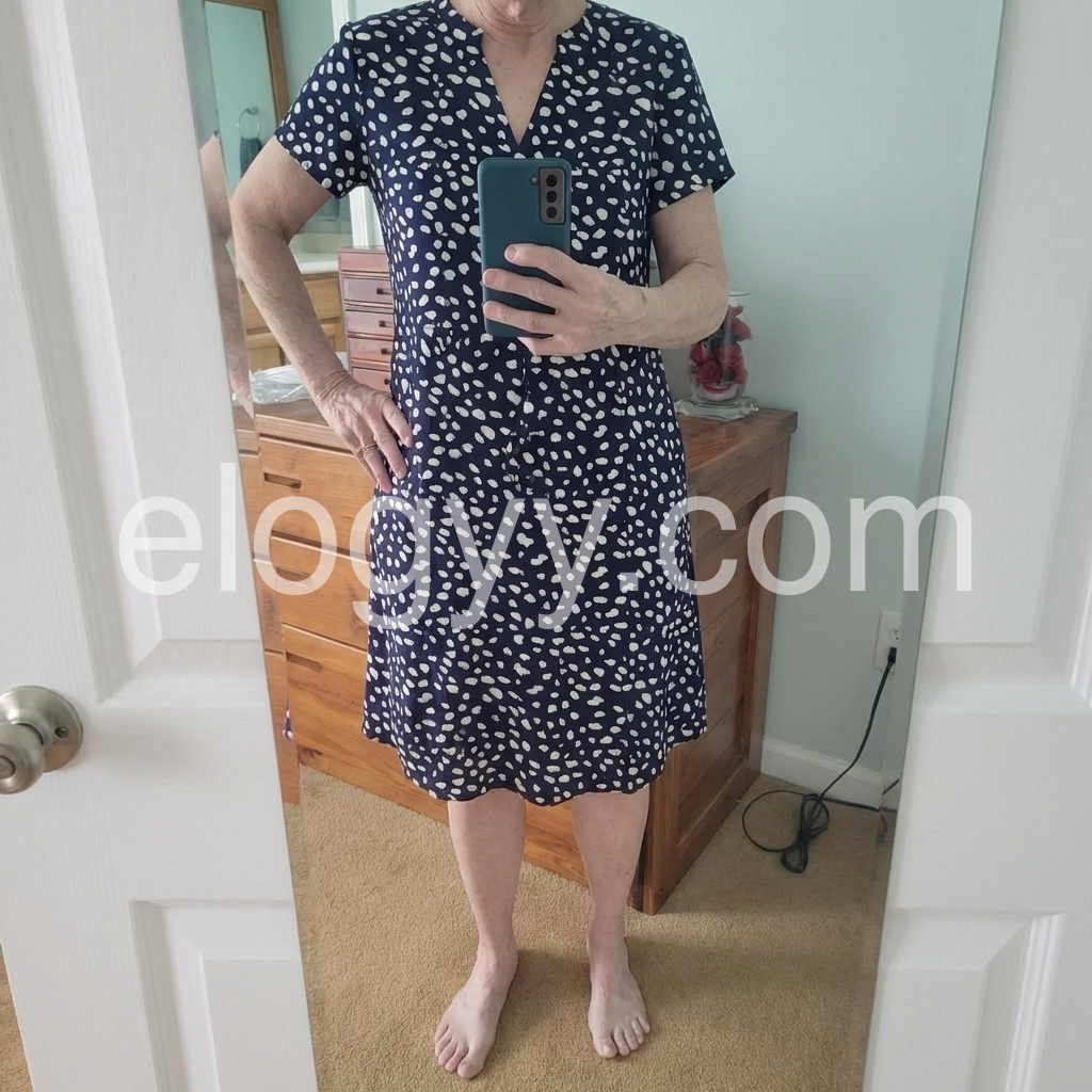 This mid-length dress features a navy base with playful white polka dots and a flattering V-neckline. Short sleeves and a relaxed fit make it perfect for warm days. Lightweight fabric ideal for casual outings or brunch. Pair with heels or sandals for a polished look. Timeless style with a cheerful touch.