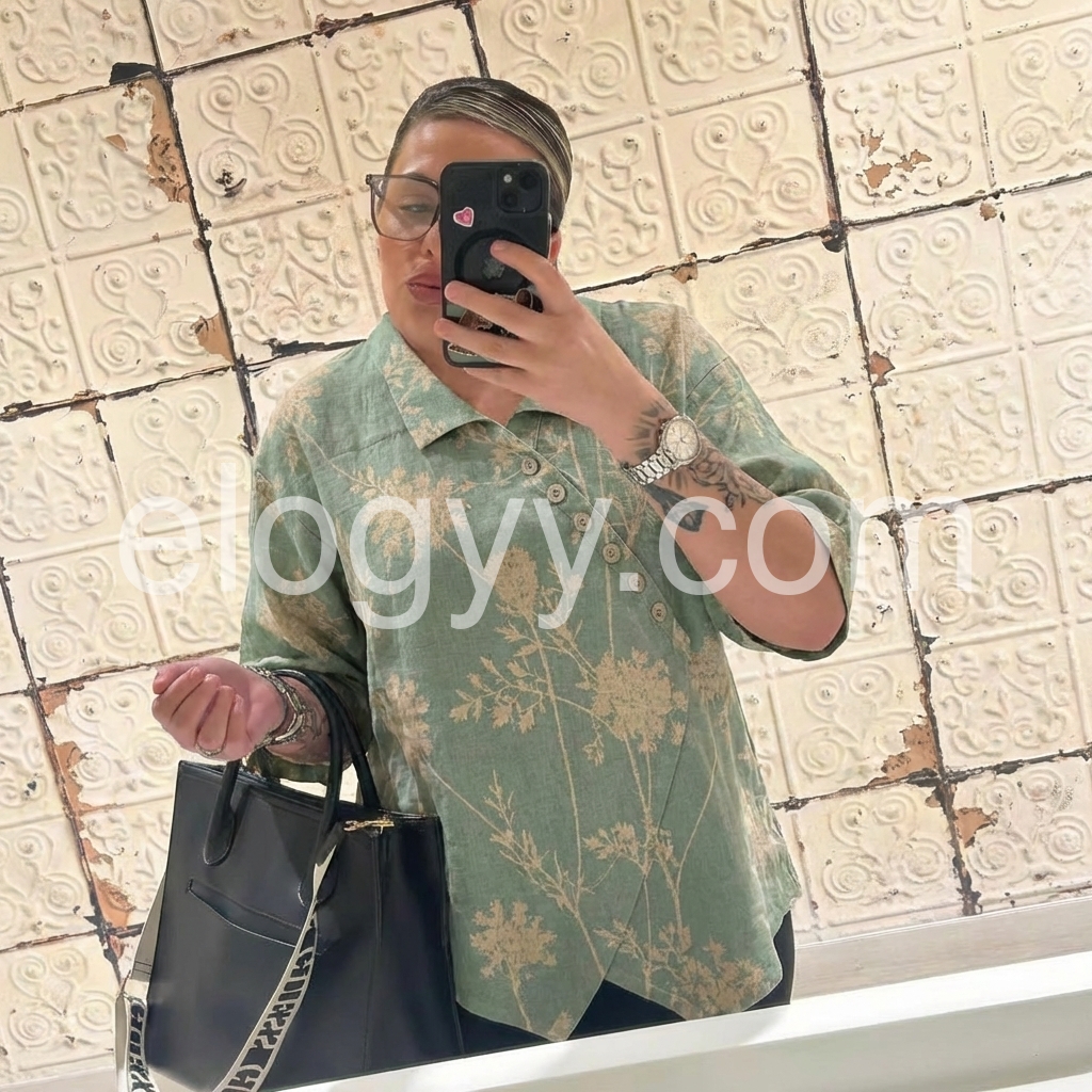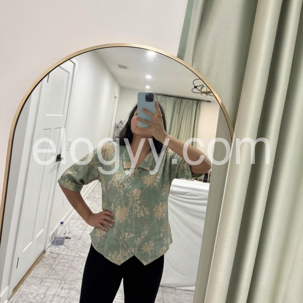 This V-neck top features a soft green base with a subtle floral print and wrap-front design. Button-down detail adds a touch of elegance. Short sleeves and relaxed fit for comfort. Perfect for casual outings or everyday wear. Effortlessly stylish with a bohemian vibe.