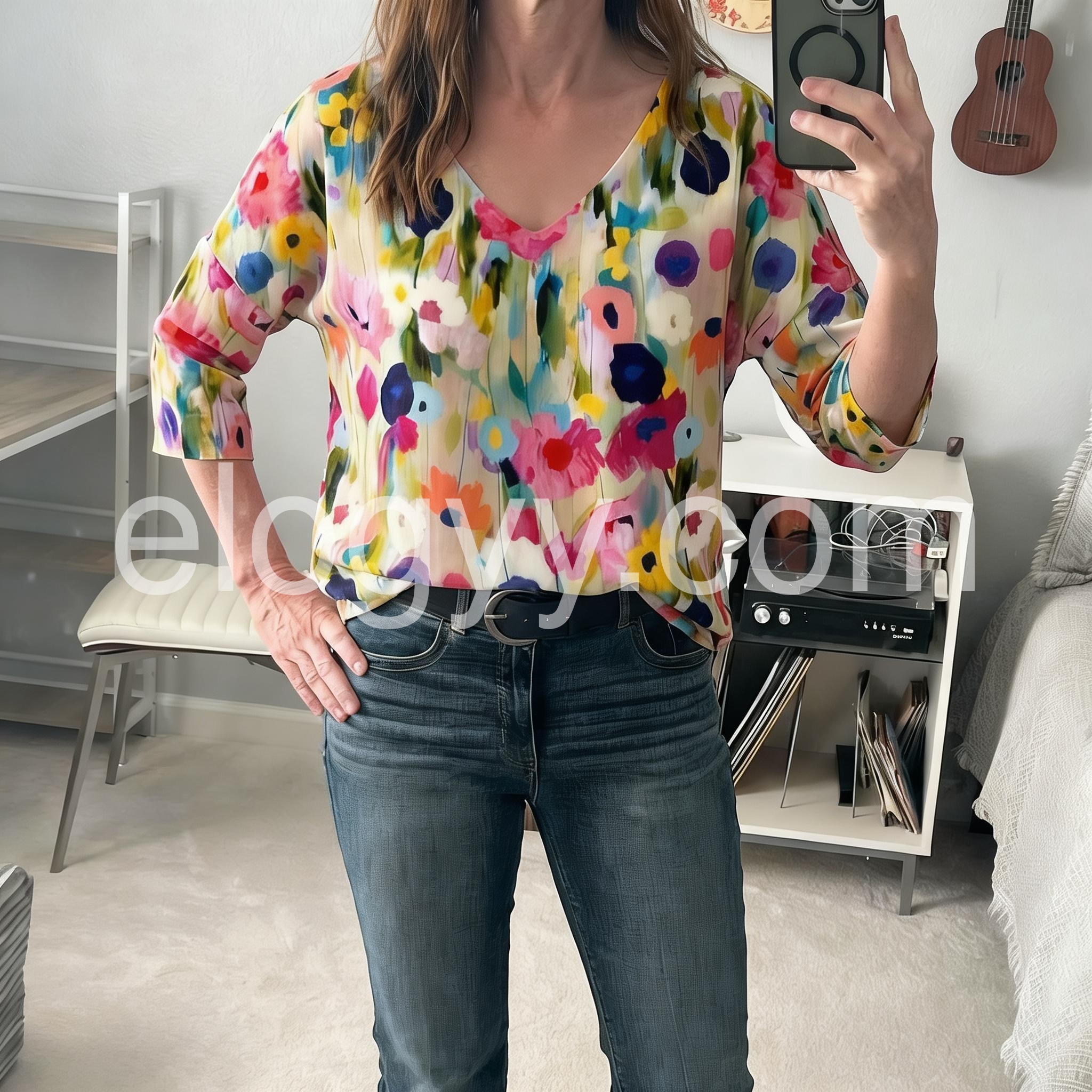 This flowy top features a colorful watercolor floral print on a soft beige base. Deep V-neckline and three-quarter sleeves with rolled cuffs. Lightweight fabric perfect for warm weather. Ideal for casual wear or beach outings. Effortlessly stylish and full of summer spirit.