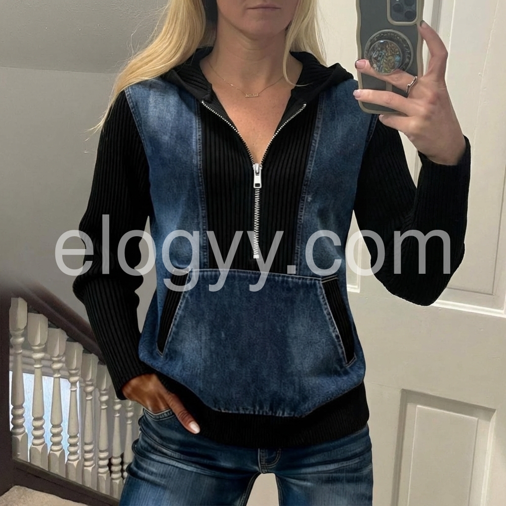 This is one of those tops that instantly upgrades your outfit. The denim front with the black ribbed contrast feels fashion-forward, and the fit looks great both for lounging and for running errands. I also love that it’s easy to layer—perfect with a tank underneath or a simple tee.
