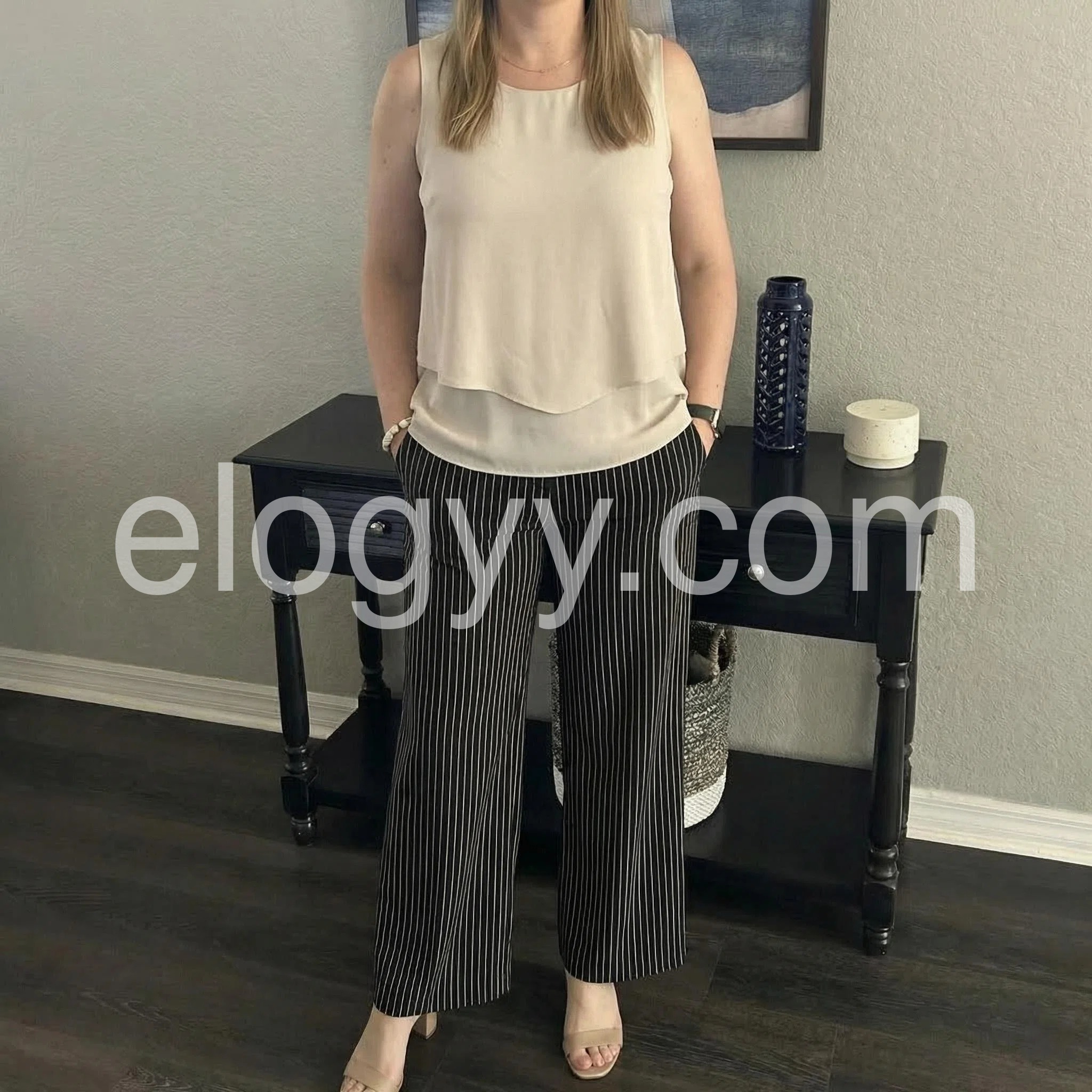 This two-piece set features a sleeveless beige top with a layered hem and square neckline. Paired with high-waisted black wide-leg pants in thin white stripes. Comfortable fit with a chic, relaxed silhouette. Perfect for casual outings or smart-casual events. Effortlessly stylish and easy to wear.