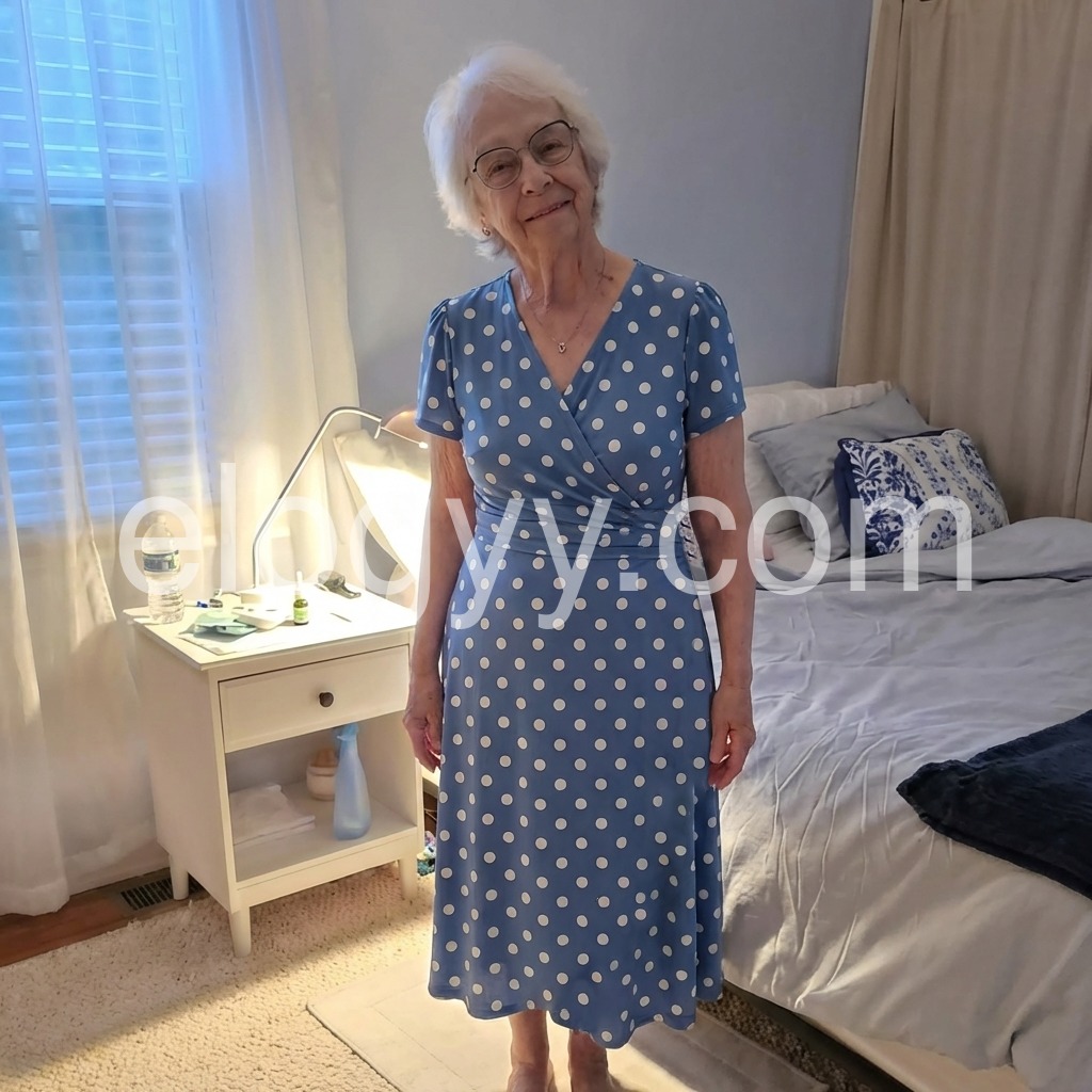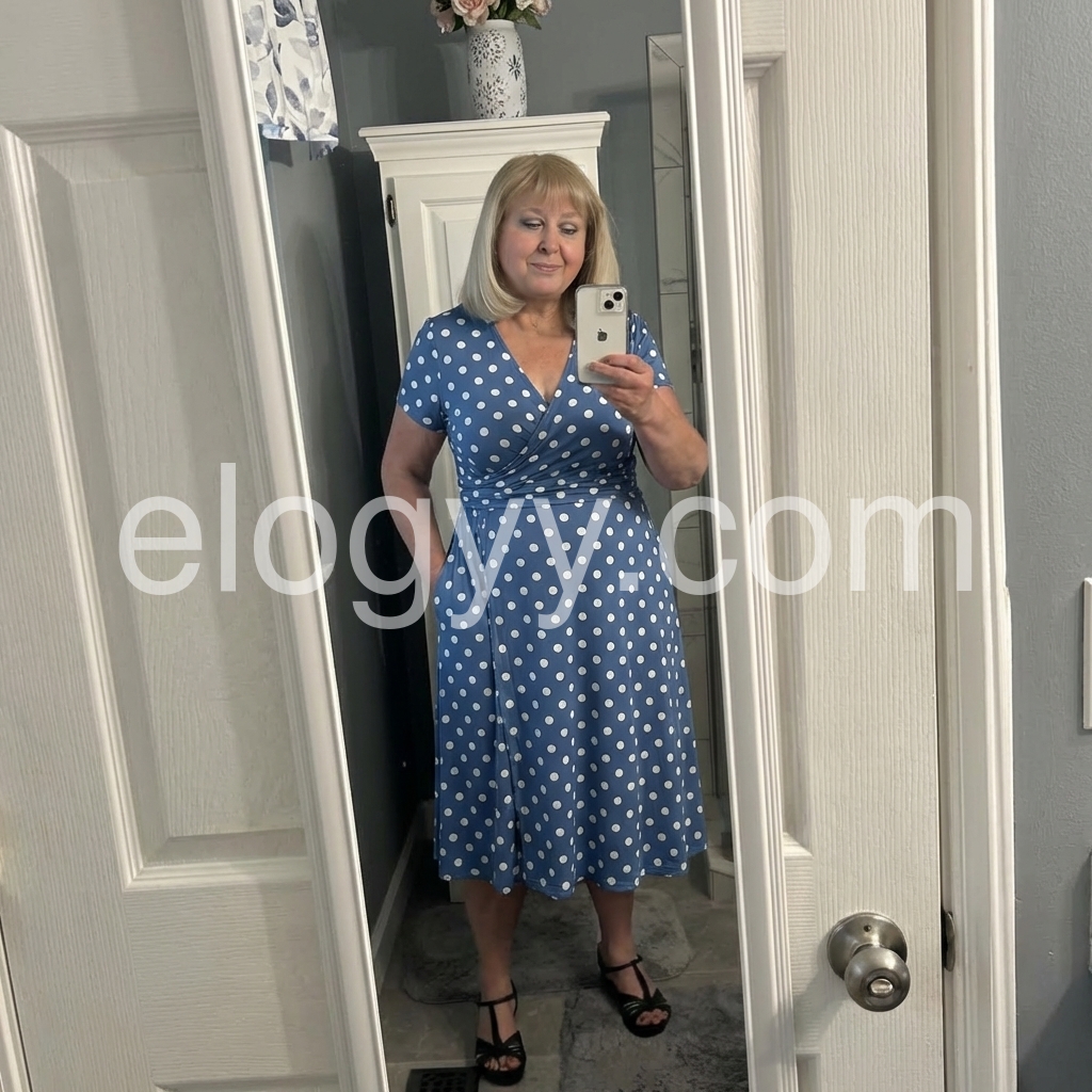 This mid-length wrap dress features a chic blue base with white polka dots. V-neckline and short sleeves for a timeless look. Fitted waist with flared skirt for a flattering silhouette. Perfect for beach outings or casual events. Sophisticated and effortless style.
