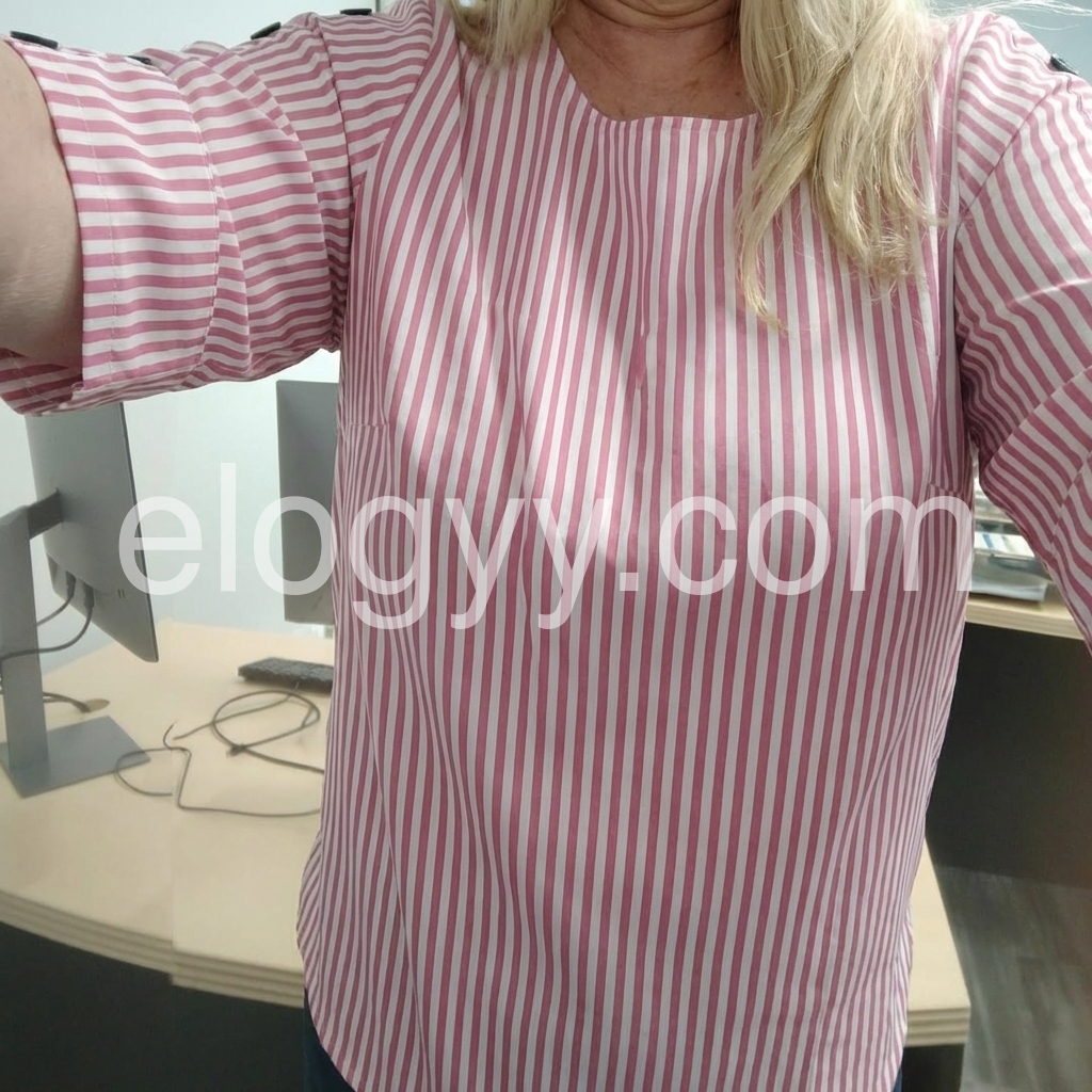 his loose-fit top features vertical pink and white stripes with stylish button details on the sleeves. Three-quarter sleeves with rolled cuffs offer a relaxed look. Round neckline for a clean, comfortable fit. Perfect for casual wear or smart-casual outfits. Bright and cheerful with a touch of elegance.