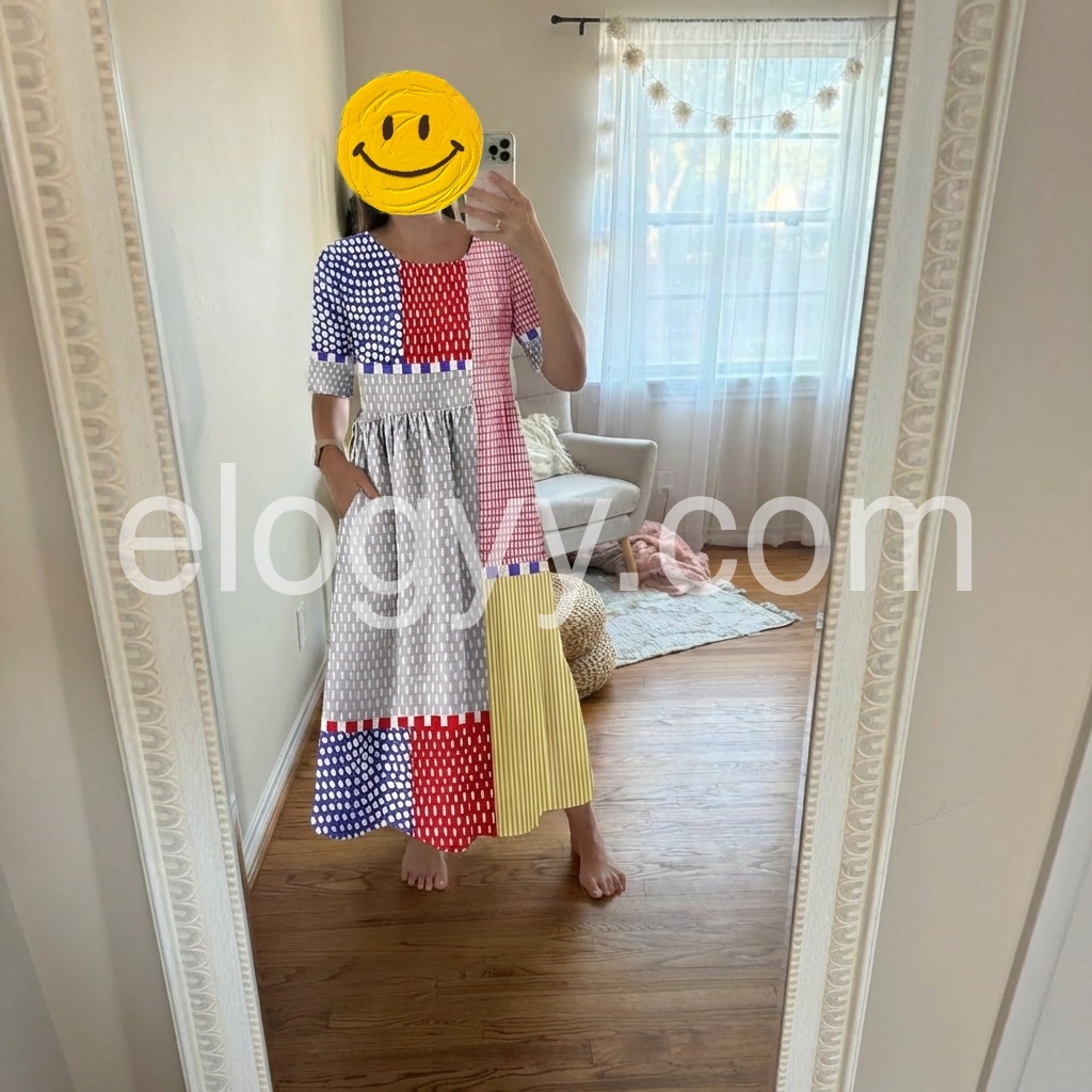 The bold, multicolored geometric patchwork print makes a striking statement, while the gathered waist and pockets add comfort and function.