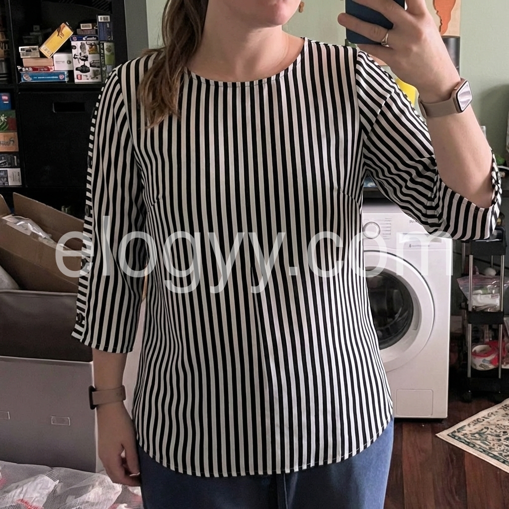 This vertical striped top features a relaxed fit with a round neckline. Three-quarter sleeves with button details and rolled cuffs. Lightweight fabric perfect for everyday wear. Ideal for pairing with jeans or trousers. Timeless and stylish design.