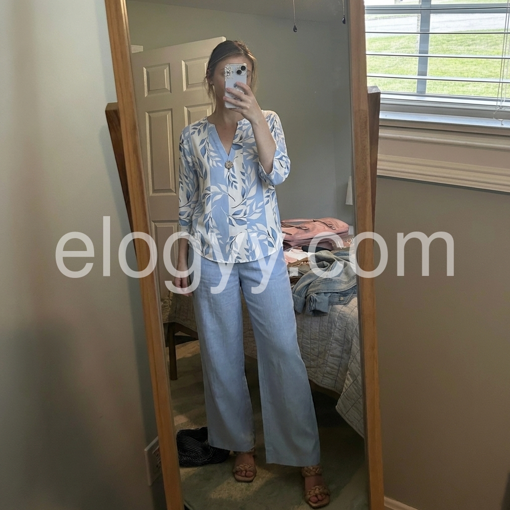 Hey fashionistas! This two-piece set is a total game-changer. The V-neck top with blue and white prints is super flattering, while the three-quarter sleeves add a touch of elegance.