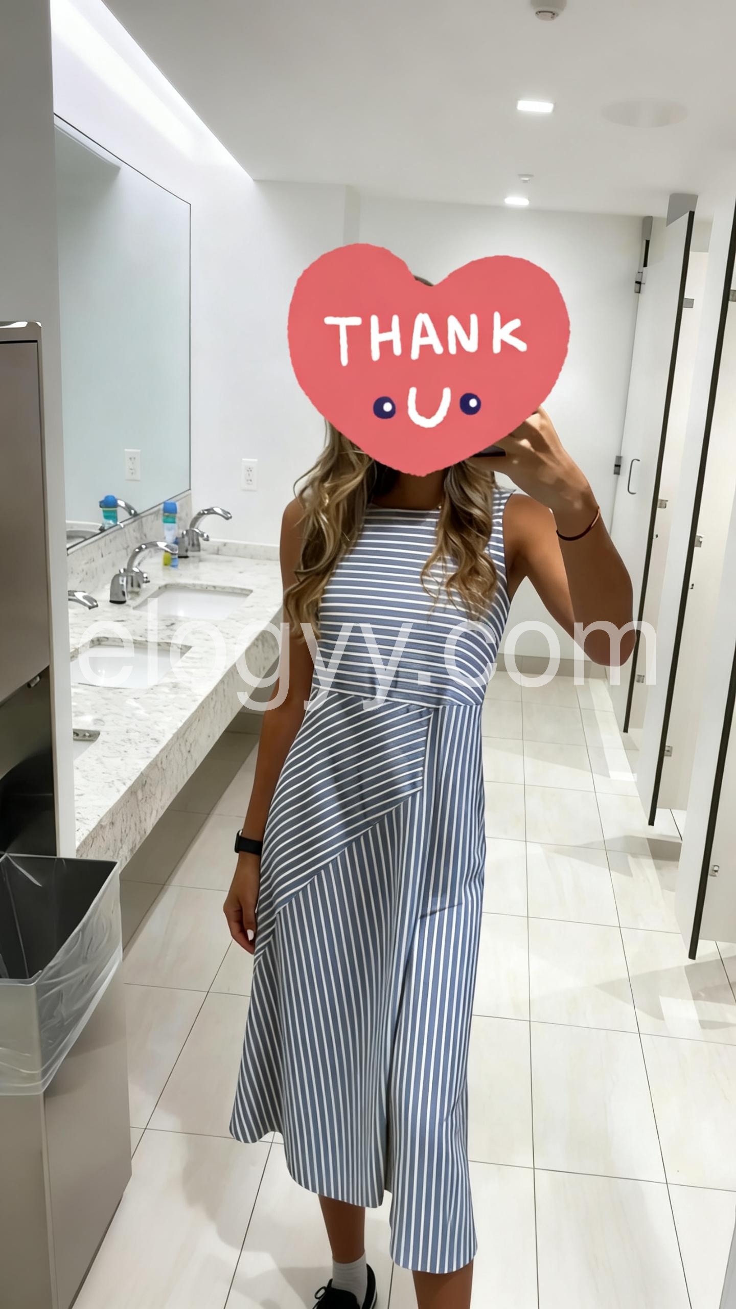 This sleeveless midi dress features a stylish blue and white striped pattern. The asymmetrical hem adds a contemporary touch. Fitted waist enhances the silhouette. Lightweight fabric perfect for summer or resort wear. Ideal for casual outings or daytime events.