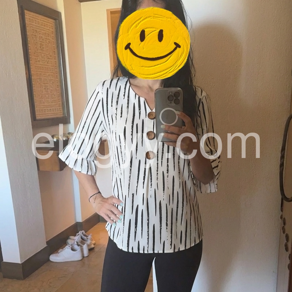 This loose-fitting top features a bold black abstract stripe print on white. V-neckline with wooden buttons down the front. Three-quarter sleeves with ruffled cuffs for a feminine touch. Lightweight and breathable, perfect for casual wear. Easy to pair with jeans or pants.