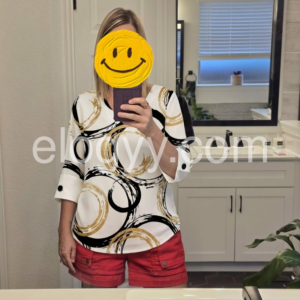Crafted from smooth, drapey fabric, it boasts a striking print of overlapping black and gold brushstroke circles on a crisp white base, blending modern artistry with sophisticated style. The fabric’s wrinkle-resistant quality makes it ideal for busy schedules.