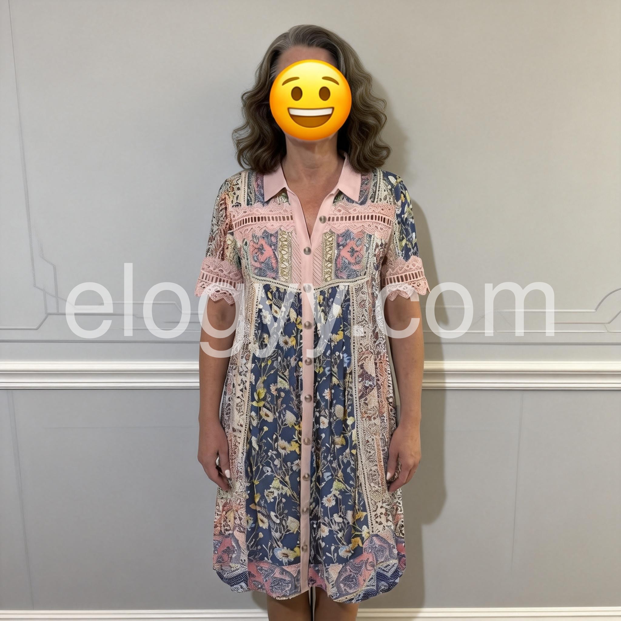 Love the functional buttons down the front. Makes it super easy to put on and take off. The pink collar is a cute contrast to the blue floral skirt part. Runs exactly as the sizing chart says.