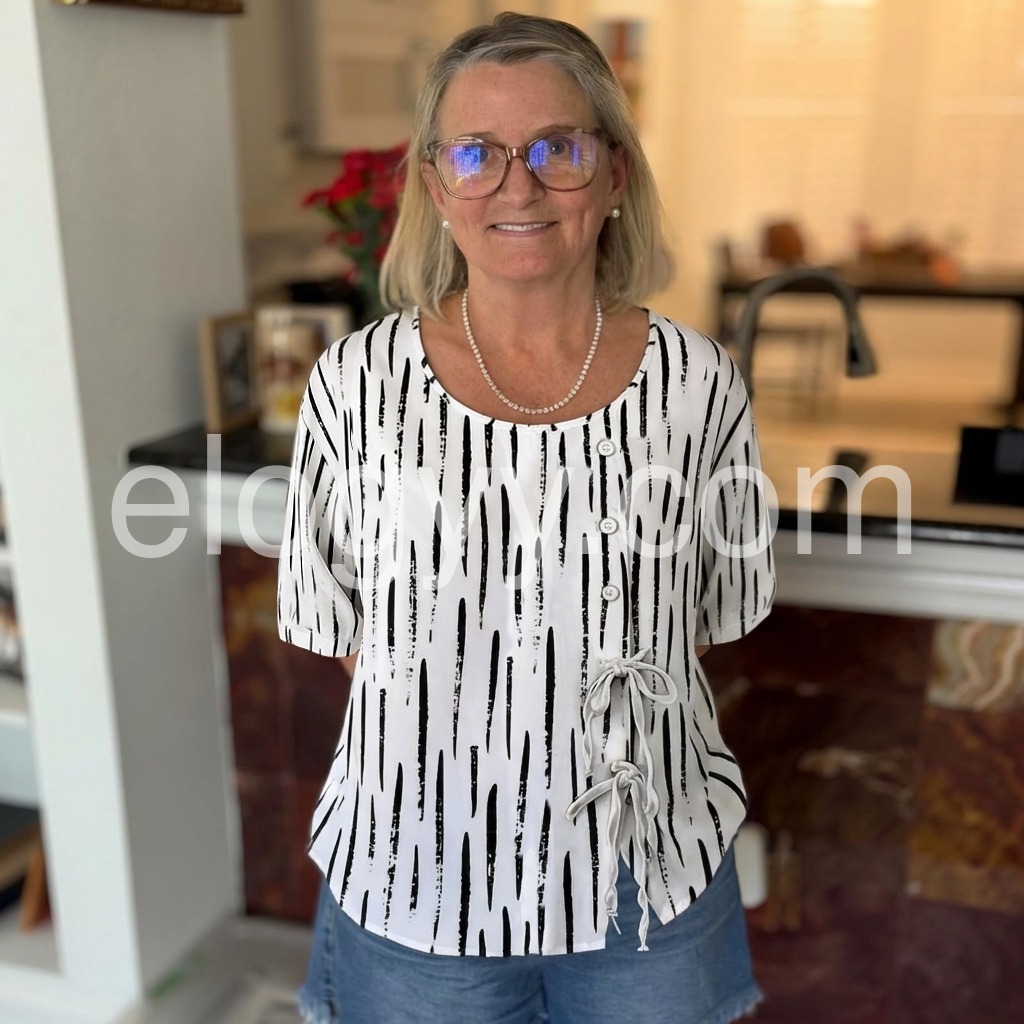 This relaxed-fit blouse features a bold black abstract stripe print on a white base. Round neckline with front button closure and side tie details. Lightweight fabric perfect for everyday wear. Ideal for pairing with jeans or leggings.