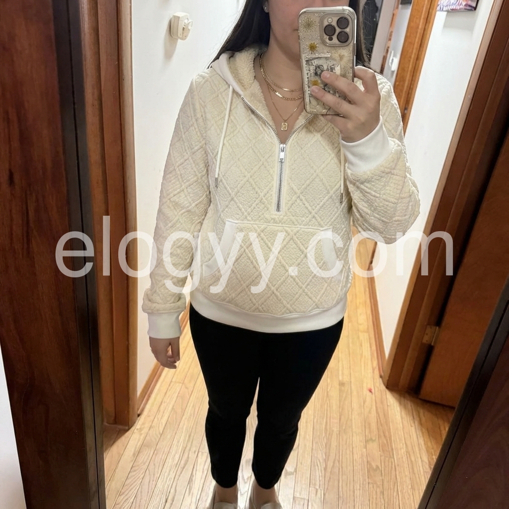 Elevate your casual wardrobe with this sophisticated beige quilted sherpa half-zip hooded sweater. The combination of quilted detailing and plush sherpa lining creates exceptional warmth without excess bulk, making it ideal for layering or wearing solo. The half-zip design offers versatile styling options and easy temperature adjustment, while the integrated hood provides additional coverage on cooler days. Perfect for transitional seasons or as a lightweight layering piece, this sweater balances comfort with refined aesthetics for the discerning wearer.