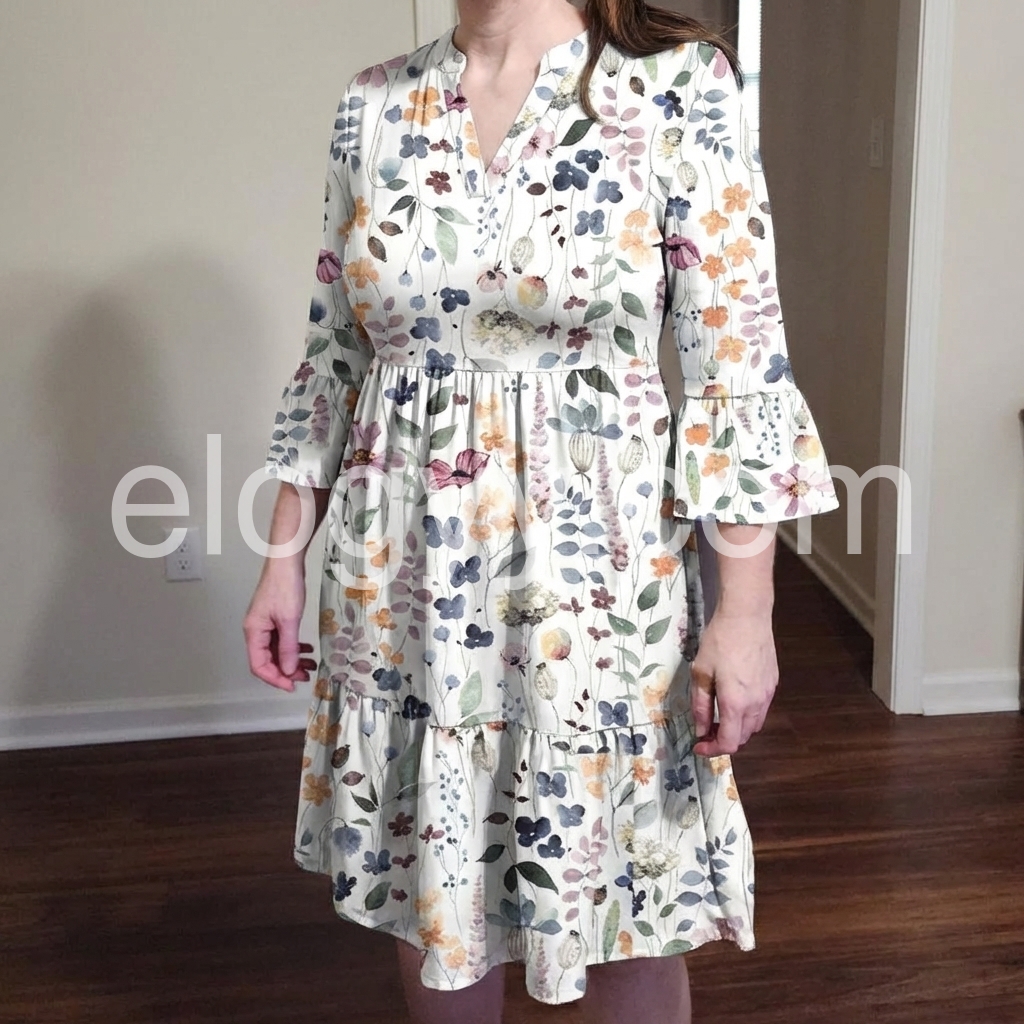 This white floral dress features a V-neck, button-down front, and flared bell sleeves. The tiered skirt adds movement and charm. Soft pastel blooms create a delicate, summery look. Perfect for beach days or casual outings. Lightweight and effortlessly feminine.