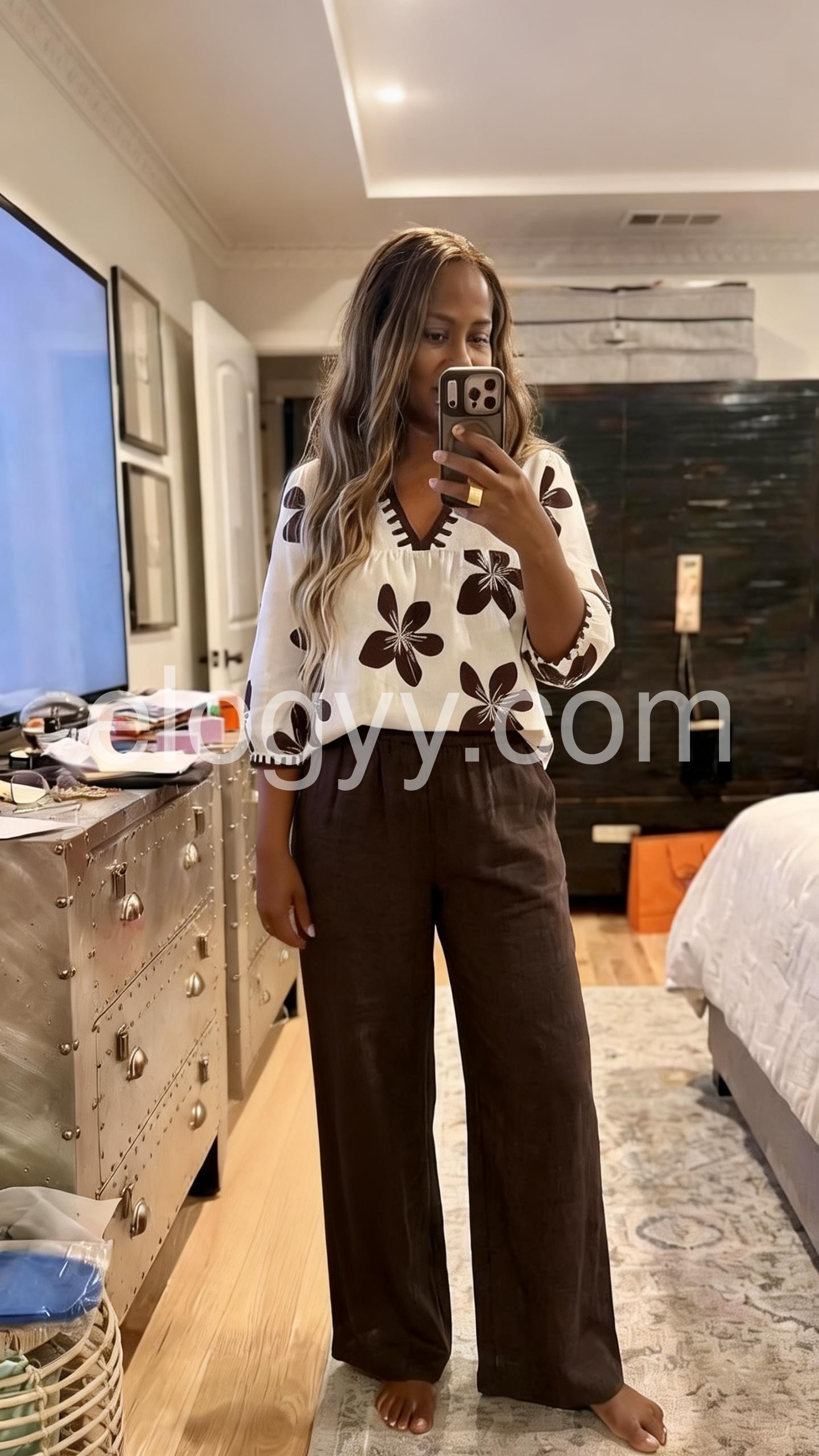This is my new favorite throw-on-and-go outfit. It requires zero effort but looks so stylish. The dark brown floral print on the top matches the pants perfectly. Definitely a wardrobe staple for spring and summer.