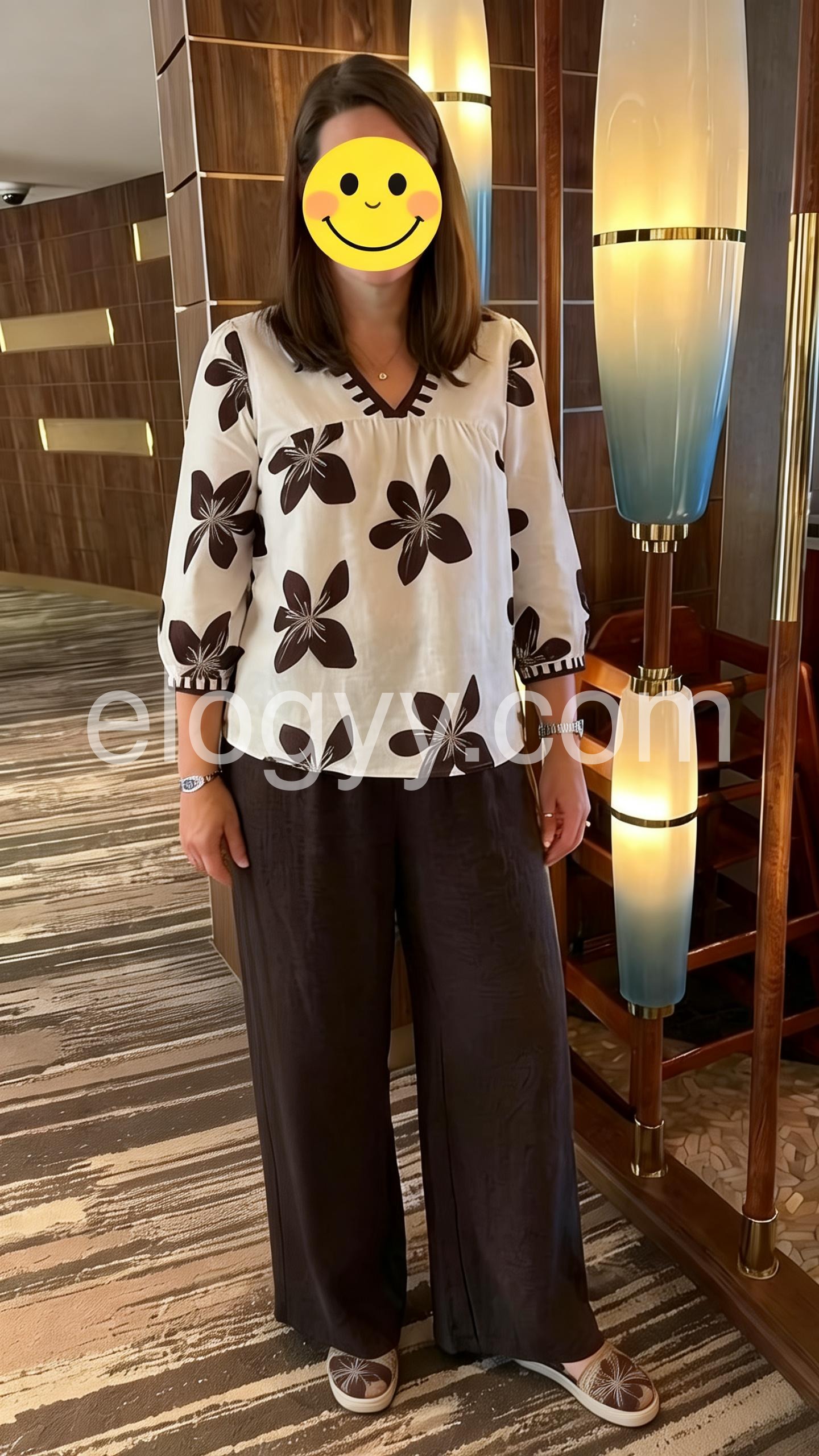 This coordinated set features a relaxed-fit top with bold black floral prints and a V-neckline. Paired with soft, wide-leg pants in dark gray for a balanced look. Lightweight fabric perfect for casual wear. Ideal for everyday comfort or summer outings. Effortlessly stylish and easy to style.