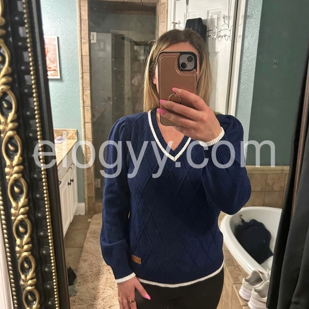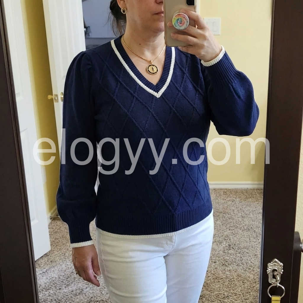 I’m obsessed with this chic navy sweater! The textured diamond pattern elevates it way beyond basic tops, and the contrast white piping makes the design pop. I’ve worn it to the office with slacks and on weekends with jeans—it’s versatile enough for every occasion, and it’s quickly become my go-to fall sweater!