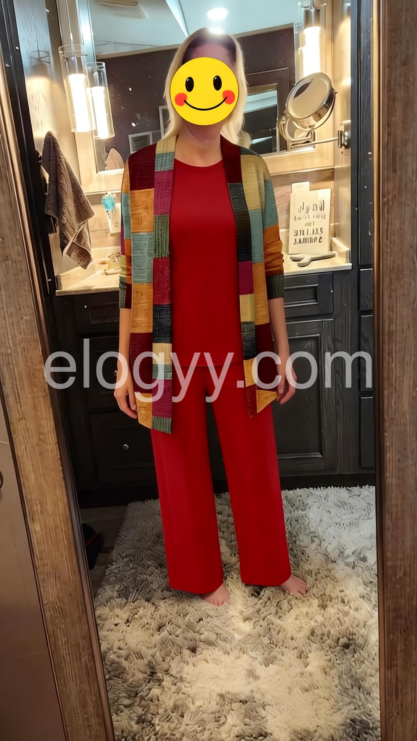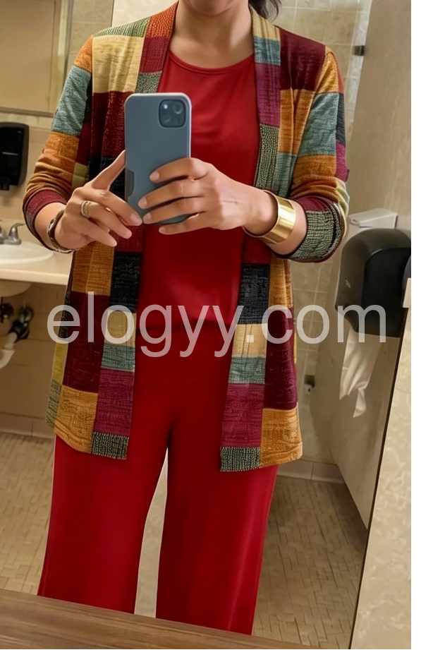 This coordinated outfit features a solid red top and wide-leg pants paired with a vibrant patchwork cardigan. The colorful, geometric design adds a modern touch. Comfortable and chic for casual or semi-formal wear. Perfect for autumn days or stylish outings. Effortlessly elegant with a pop of personality.