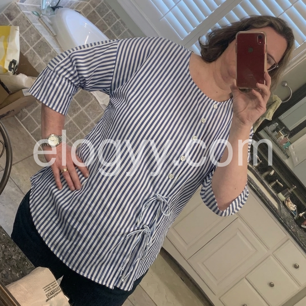 This loose-fit top features vertical blue and white stripes with a clean, casual look. Round neckline and front button-down design for easy wear. Side ties add a feminine touch. Three-quarter sleeves with rolled cuffs. Perfect for everyday comfort and effortless style.