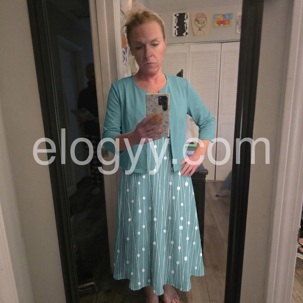 I am so pleased with this purchase. As an older woman, it is hard to find dresses that are both modest and fashionable. This teal two-piece set hits all the marks. The fabric flows nicely and does not cling to my midsection. Very elegant and comfortable.