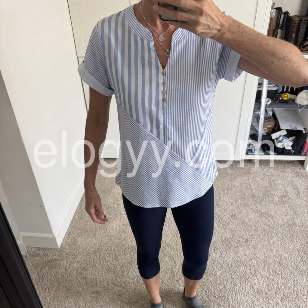 This short-sleeve top features vertical blue and white stripes. V-neckline with front buttons and a stylish wrap design. Cuffed sleeves add a polished touch. Lightweight and perfect for casual wear. Ideal paired with jeans or trousers.