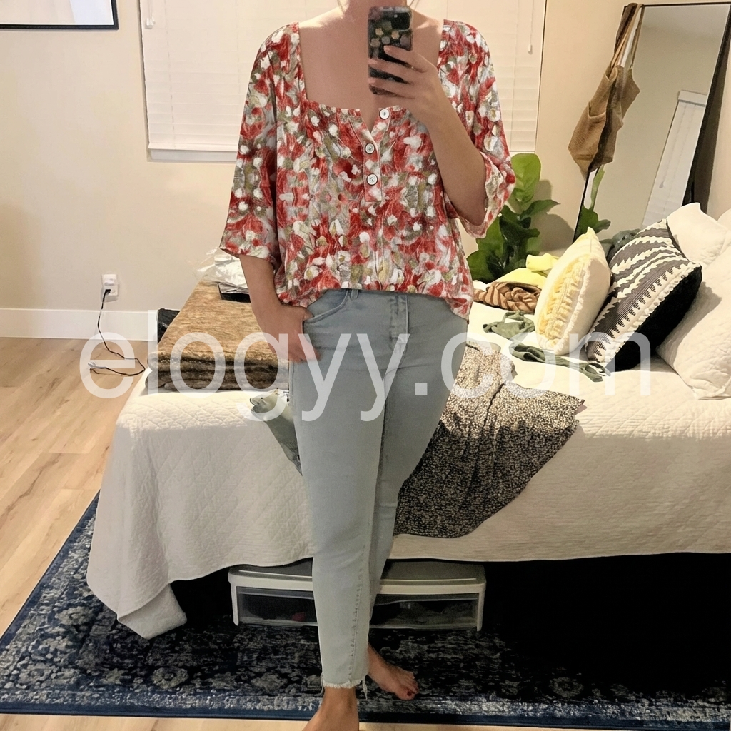 This casual blouse features a flattering square neckline and loose fit, designed to offer all-day comfort and a relaxed silhouette. The half-sleeve cut keeps you cool while adding a touch of elegance to your look.