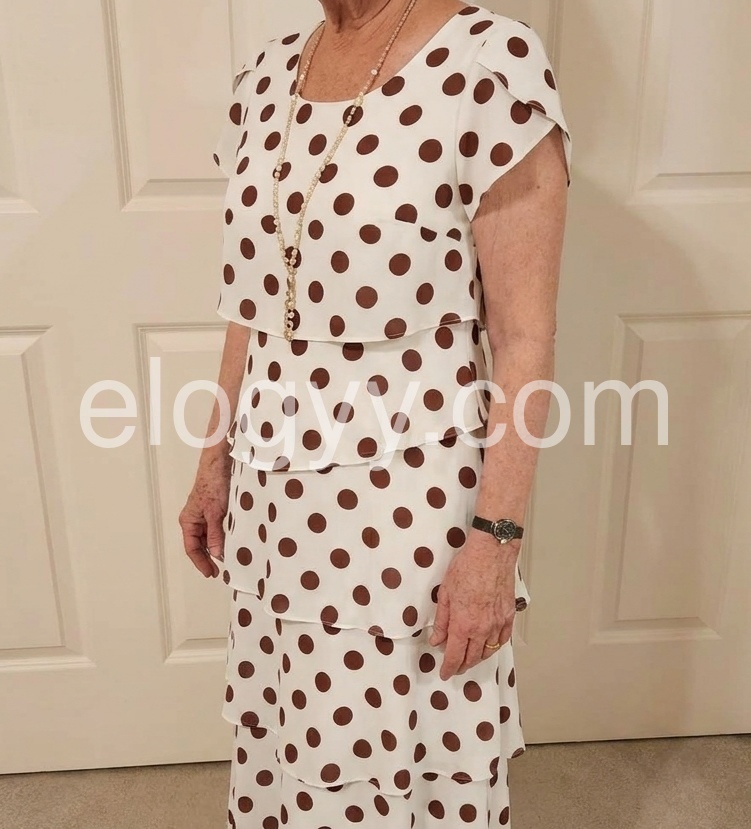 This tiered dress reimagines polka dots with modern flair. The large brown dots on a creamy base feel retro yet fresh, while the tiered ruffle skirt adds soft movement and volume. The relaxed fit skims over hips and thighs, making it comfortable for all-day wear.