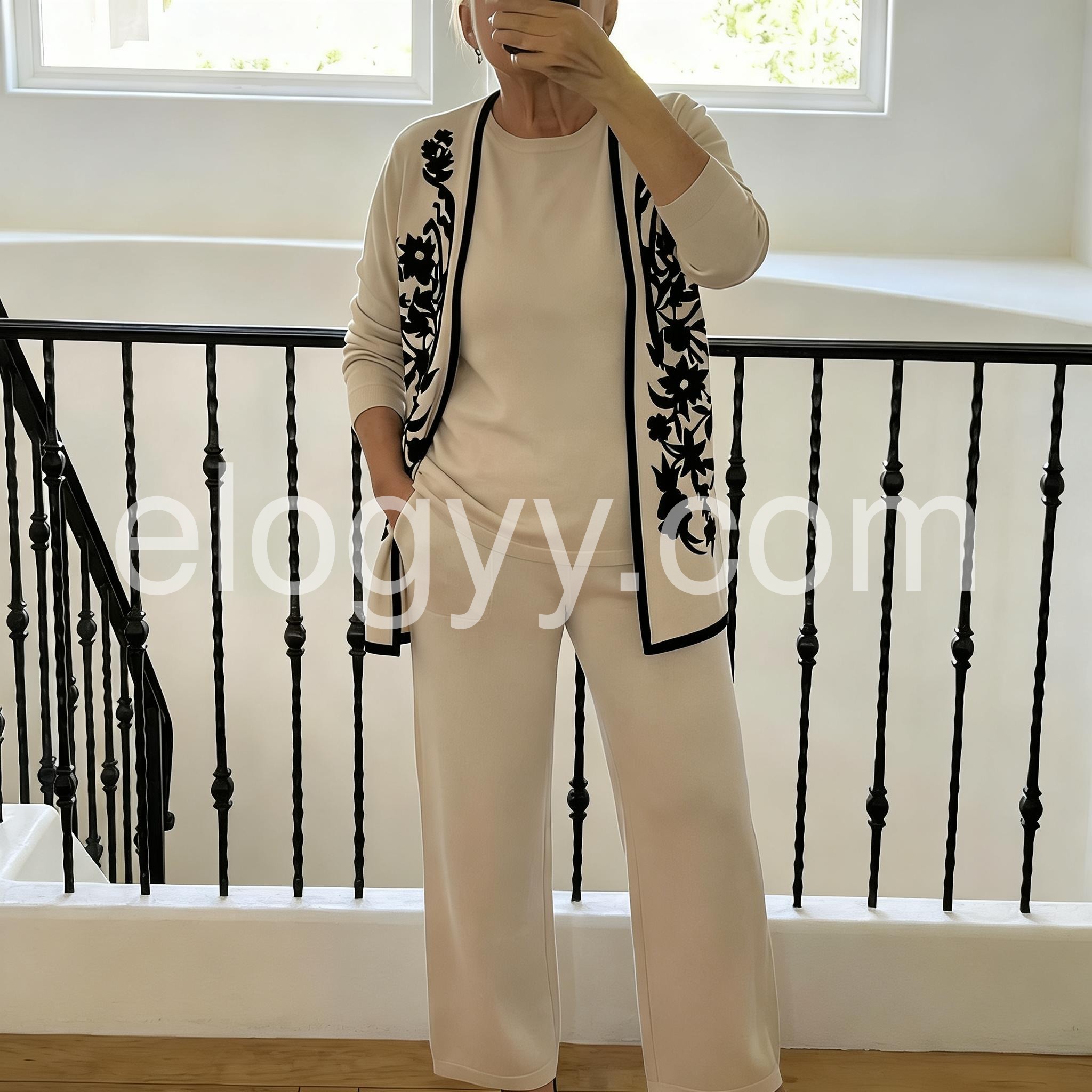 This coordinated three-piece set features a soft beige top, wide-leg pants, and an open-front cardigan with black floral embroidery. The clean lines and subtle contrast create a refined look. Perfect for casual outings or relaxed elegance. Comfortable, stylish, and effortlessly chic.