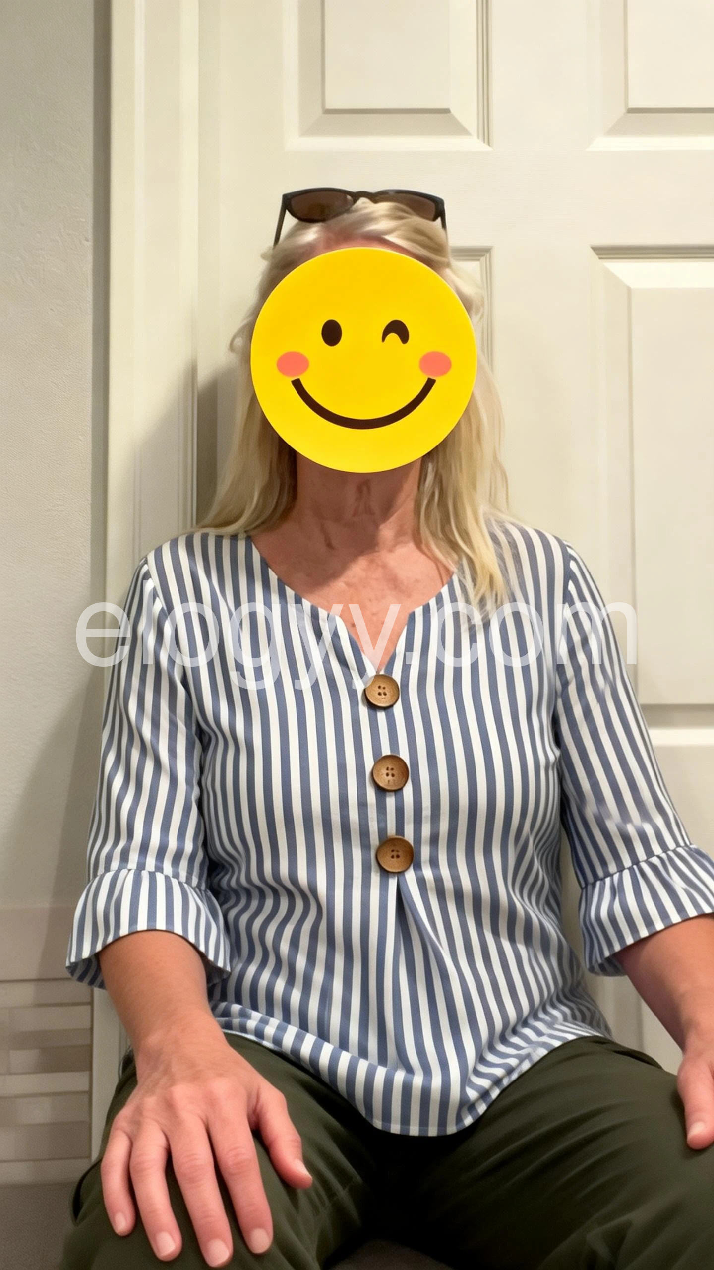 This three-quarter sleeve top features vertical blue and white stripes. V-neckline with front wooden buttons for a relaxed look. Flared ruffle cuffs add delicate detail. Lightweight fabric perfect for casual wear. Ideal for pairing with jeans or skirts.