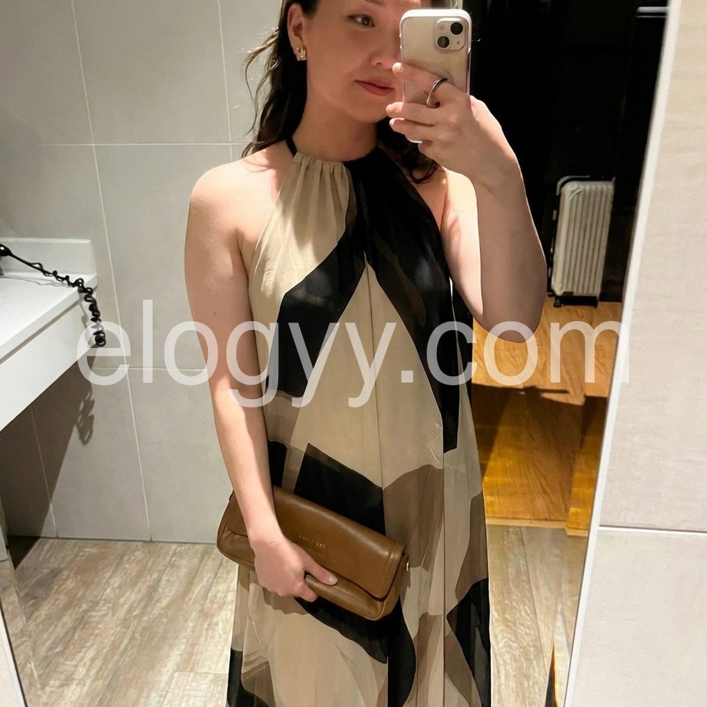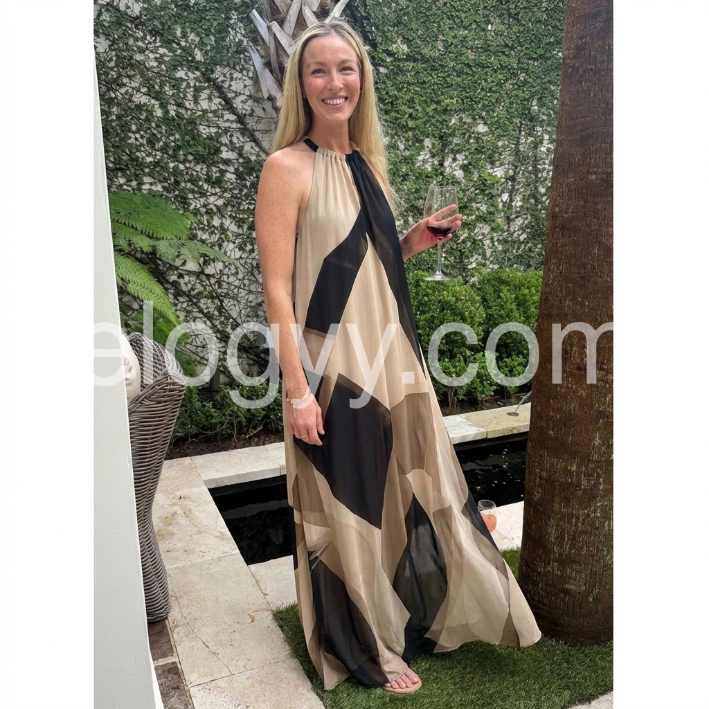 This halter-neck maxi dress features a bold geometric pattern in black and beige. Lightweight, sheer fabric creates a graceful drape. Sleeveless design with a high neckline for a modern look. Perfect for formal events or stylish outings. Effortlessly chic and sophisticated.