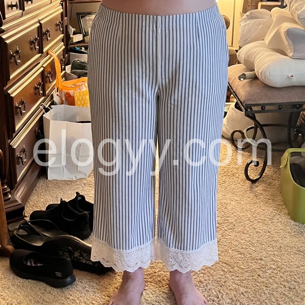 These relaxed-fit pants feature vertical blue and white stripes with a delicate lace trim at the hem. Elastic waistband and side pockets for comfort. Lightweight fabric perfect for warm weather. Ideal for beach days or casual outings. Effortlessly stylish and breezy.