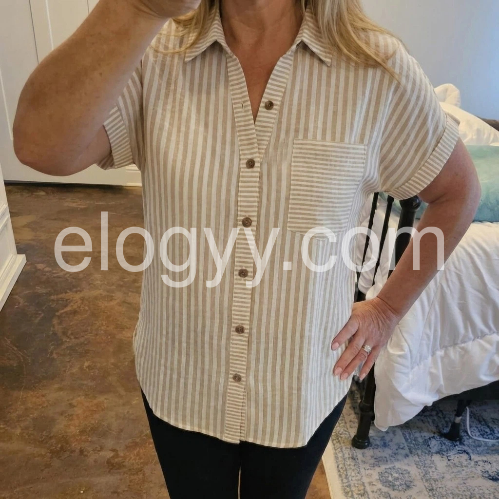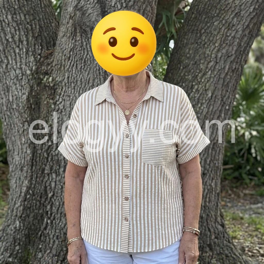This short-sleeve shirt features vertical brown and white stripes with a classic collar. Front button closure and chest pocket add practical style. Soft, lightweight fabric for all-day comfort. Perfect for casual wear or layering. Effortlessly chic and easy to pair.
